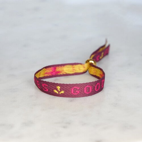 Dit is een armbandje gemaakt van lint die je met een schuifkraal strakker en losser kunt maken.D e schuifkraal is gemaakt van stainless steel. Op dit armbandje staat de tekst 'GOOD VIBES'